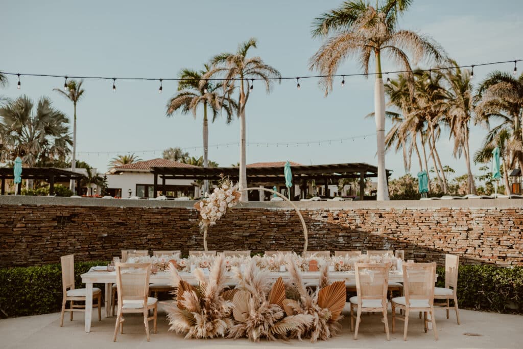 Cabo wedding reception on an ocean view terrace. Neutral wood and beige colors.