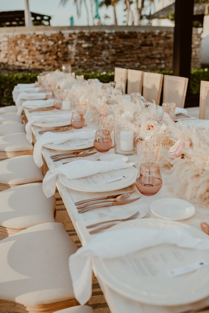 With vellum paper menus and the classiest rosé gold rim water goblets, elegance made its presence on each table. The neutral color palette merged perfectly integrating all details to achieve the perfect “beach wedding vibe” that Sam & Mike were looking for.
